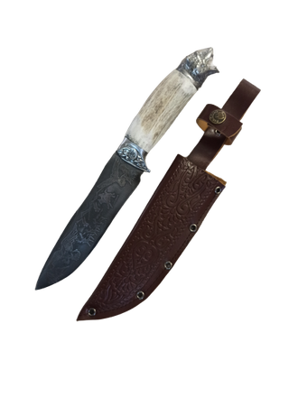 Пчак арт26 средний оленьи рога, гарда гравировка, голова медведя ШХ15